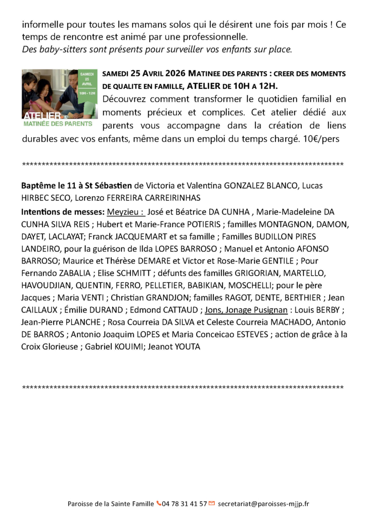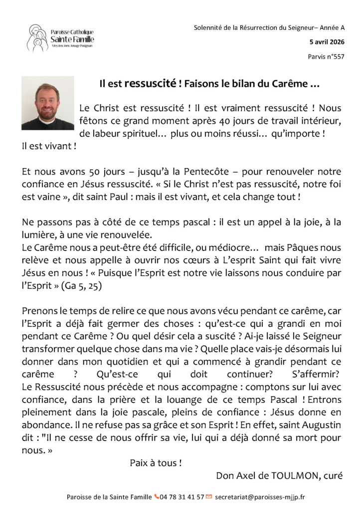 - Le parvis de la semaineActualités, Rendez-vous paroissiaux, Horaires de messes, Familya, Patronage et bien d’autres informations.