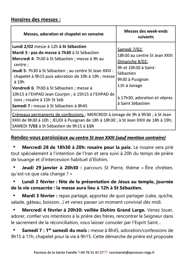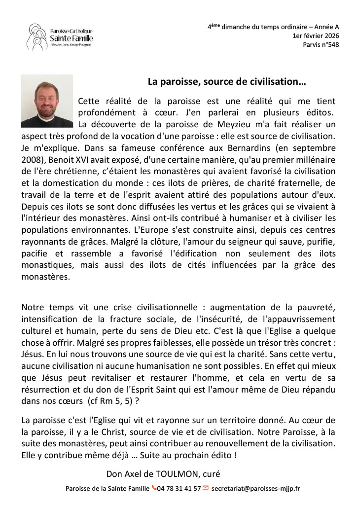 - Le parvis de la semaineActualités, Rendez-vous paroissiaux, Horaires de messes, Familya, Patronage et bien d’autres informations.